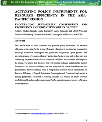 Activating policy instruments for RE in the Asia-Pacific region This article aims to cover activities that promote policy instruments for resource efficiency in the Asia-Pacific region. Resource efficiency is presented as a concept to encourage sustainable consumption and production and promote ‘green growth’. The article then describes two best practice exchange initiatives that support frameworks for resource efficiency and the integration of related considerations into governmental decision making.