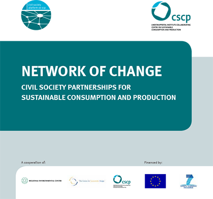 Network of change This booklet presents examples of successful promotion of sustainable consumption and production (SCP) through civil society organisation (CSO) partnerships. In addition to CSOs themselves, the target audience for this booklet includes researchers, policy makers and businesses interested in working with CSOs. The booklet introduces a Network of Change with a focus on civil society organisations and presents five different CSO partnership models to promote SCP.