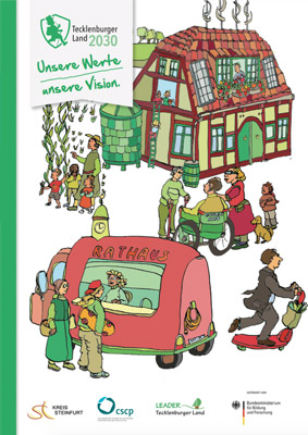 The Tecklenburg Region 2030: Our Values, Our Vision Beautifully illustrated by Käthe Wenzel, the report “The Tecklenburg region 2030: Our Values, Our Vision” literally paints a picture of a Tecklenburg future that, while remaining very realistic, dares to be innovative and hopeful. It is realistic as it clearly identifies demanding challenges and trends in different societal sectors until 2030; it is innovative in the way that it directly provides recommendations on how to act and moreover who can act on these challenges; and lastly, it is hopeful because it does not just stop at problem-solving but aims to truly enable communal wellbeing – knowing that a fruitful tomorrow is more than just the solution of today’s problems. The report functions as a useful tool for building the future as envisioned by the local Tecklenburg people and provides an outlook over sustainable living in the area in 2030 as well as the regional soft skills and social innovation that will be required for that.